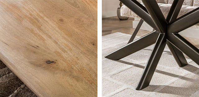 De eettafels uit de Cliff‑serie hebben een update gekregen. De uitvoeringen van 180 cm en 215 cm zijn voortaan voorzien van een brons‑bruin metalen frame. Daarnaast heeft het massief mangohouten blad een verbeterde zandkleurige finish gekregen.