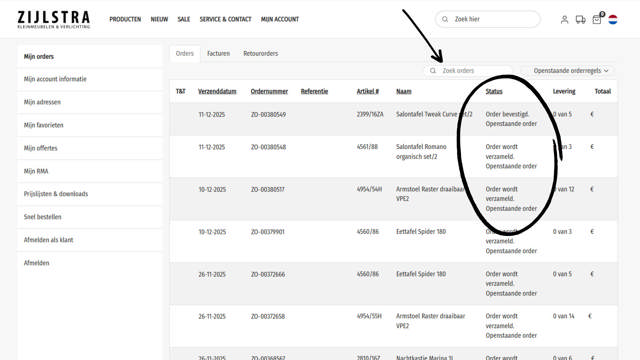 - In de kolom Status vind je per order en orderregel de actuele status.